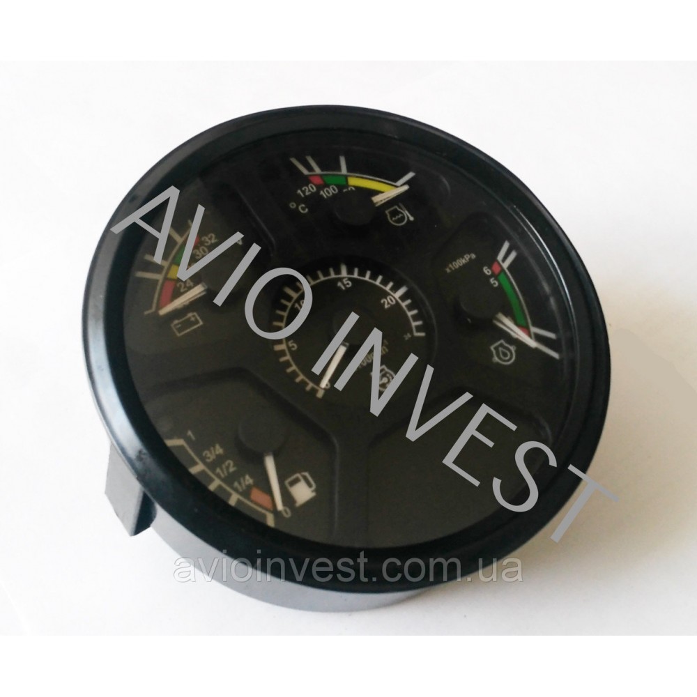 Назначение: для контроля уровня топлива в баке (О-П – полный бак), давления масла в системе смазки двигателей (0-10)х100 кПа, температуры в системе охлаждения двигателя(40-120 0С), напряжения (18-32 В) в бортовой сети автомобиля и оборотов двигателя, состоят из пяти измерительных механизмов.